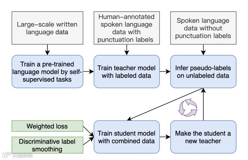 针对标点预测依赖大量标注数据的问题,提出区分式自学习方法,采用加权损失与差异化标签平滑技术,联合训练人工标注与伪标签数据。