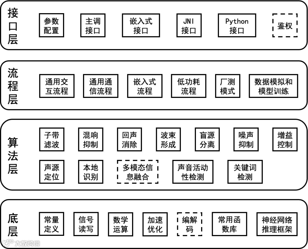 核心技术包括:基于盲源分离理论的统一信号处理框架,在多人干扰(鸡尾酒会)场景中表现优异,获头部教育平板厂商认可为业内最佳2mic方案;针对扫地机器人等极低信噪比场景,实现阵列信号处理与唤醒模型的联合优化,显著提升唤醒性能。