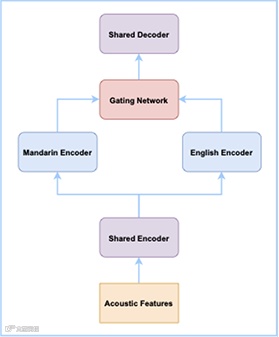 中英文混说(如“看下paper”)是语音识别难点,主因是混合语料稀缺、标注成本高,且单语数据混合训练易相互干扰。达摩院借鉴“混合专家系统”(MoE)思想,为中文和英文分别设计子网络(专家),底层共享、高层独立,并通过门控模块加权输出。