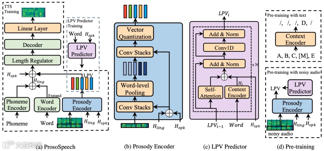 模型结构包括音素编码器、词编码器、长度规整模块、解码器、韵律编码器与隐藏韵律矢量(LPV)预测网络。通过目标梅尔谱低频部分提取LPV,并与语言学特征融合,实现端到端韵律控制。