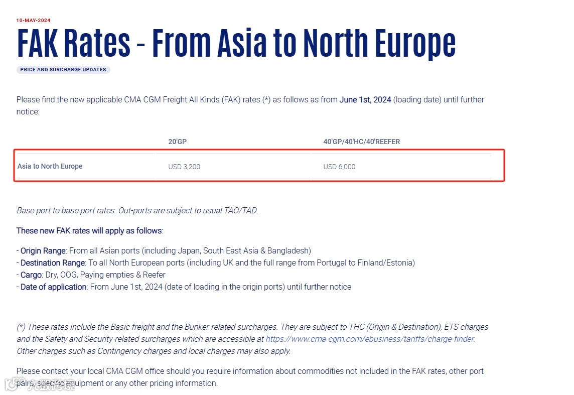 达飞轮船发布公告表示,自6月1日起,将再次上调亚洲至北欧的FAK费率,每20英尺集装箱为3200美元,40尺柜包括高柜和冷藏箱为6000美元,直至另行通知。
