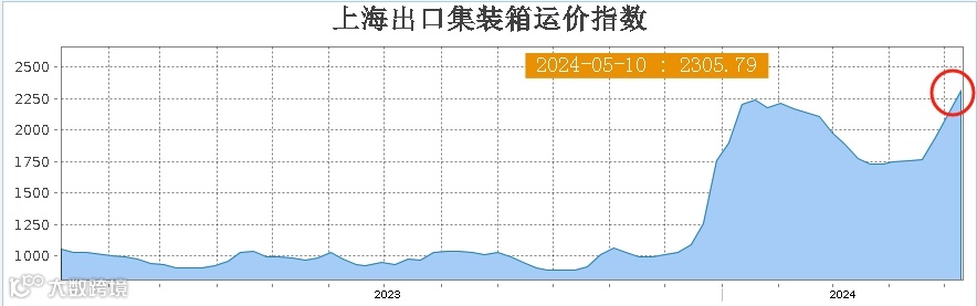 根据上海航运交易所最新发布(5月10日)的数据显示,本期上海出口集装箱综合运价指数(SCFI)为2305.79点,较一周前上涨18.8%,与一个月前相比涨幅达到31.2%,超过了今年1月中旬2239.61点的高点,创下年内新高。