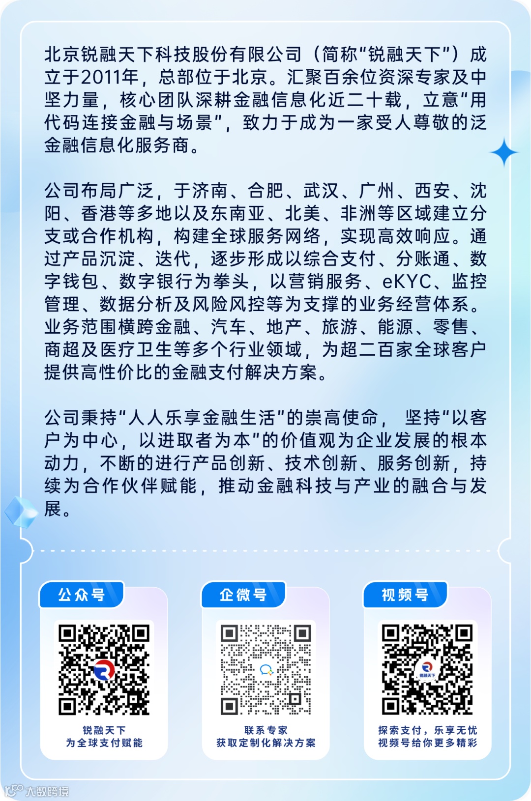 在数字经济与全球化交织的新时代,支付行业正经历一场由智能技术驱动的深刻变革。跨境贸易的蓬勃发展、预付卡场景的多元化需求,以及监管政策的持续升级,共同推动着支付平台向智能化、场景化、合规化方向演进。锐融天下凭借其领先的技术实力与行业洞察,为三方支付公司量身打造全新跨境+预付卡支付平台,以“智能驱动”为核心,重构支付价值链条,助力合作伙伴在变革中抢占先机。