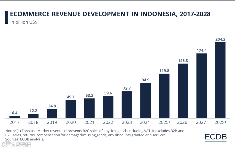 随着科学技术进步与互联网的应用,印度尼西亚早在2019年电商渗透率仅为23%,到2023年将增长至32%。预计到2028年这一比例将达到46%。