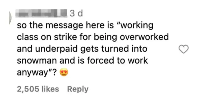 人们的不满在于认为视频隐喻了工人阶级因工作过度、工资过低而罢工,结果却被变成了雪人,还被迫继续工作。罢工、变卖物资换钱等不合时宜的设定令许多观众被深深刺痛。