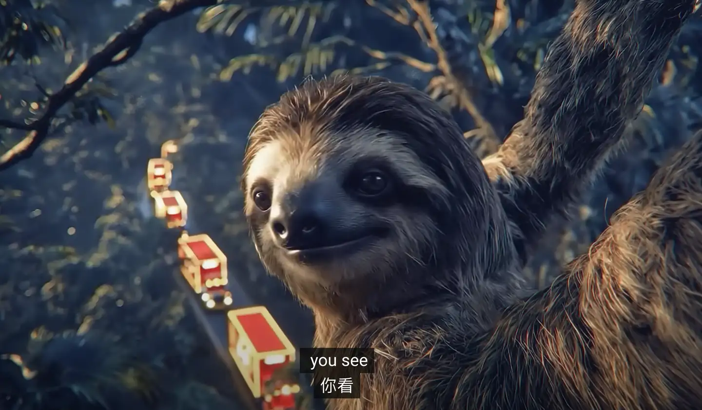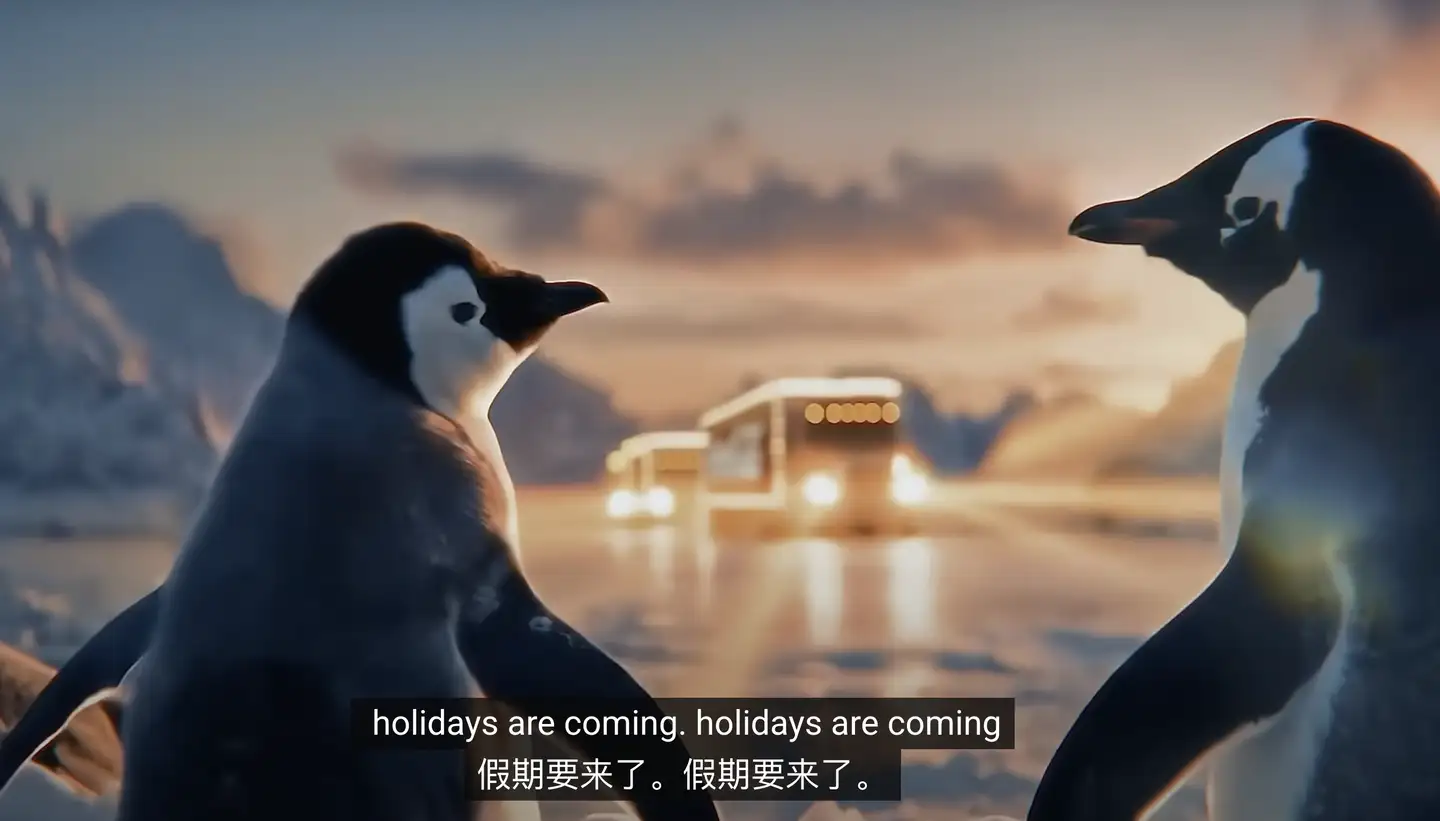 某百年饮料品牌连续两年使用AI制作圣诞广告,也连续两年口碑翻车……视频大致内容是冰天雪地里的动物们看到一列该品牌的车队驶来,纷纷感叹假期来了。品牌知名度高,这个设定没毛病,但生活在地球两极的北极熊和企鹅、生活在热带雨林的树懒几乎前后脚出现在同一片冰雪环境里,这合理吗?