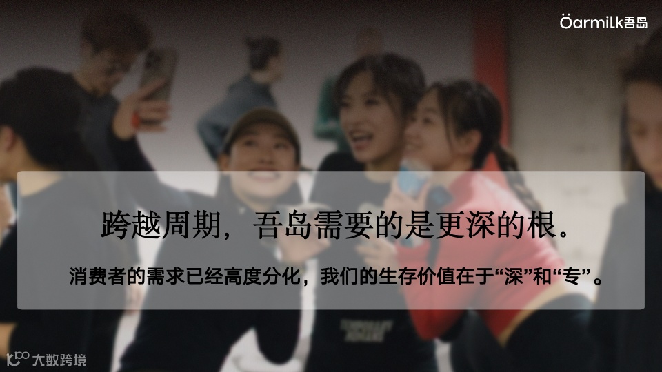 针对市场,我们的策略就是真诚。我总说吾岛的消费者都是最聪明的消费者,为什么呢?他们会算账。如果大家经常喝酸奶,可以算一笔账,牛奶里面最重要的是什么东西呢?蛋白质,钙,脂肪,菌。但是大部分消费者去购买牛奶和酸奶的时候会首先被价格低的、包装尽可能大的产品所吸引。大家往往不会进一步思考,我购买的产品里有多少是营养干物质?蛋白质含量有多少?钙的含量有多少?有些更大包装价格更低的产品里面只是水含量更高而已。我们主打的产品是 9 克蛋白质的希腊酸奶,如果算一下每克蛋白的价格,就会发现吾岛的产品是便宜的。这样的定位,让我们从 2021 年产品上架以来,每年增长实现翻倍。这就是我们怎么去坦诚跟消费者交流的策略。