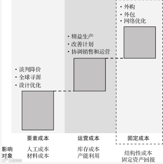 要素成本(料、工、费)可通过谈判降价、全球寻源、设计优化降低;运营成本(如仓储、库存)可通过精益生产、销售与运营协同改善;固定成本(如设备投资)可通过外购、外包、网络优化实现节约。