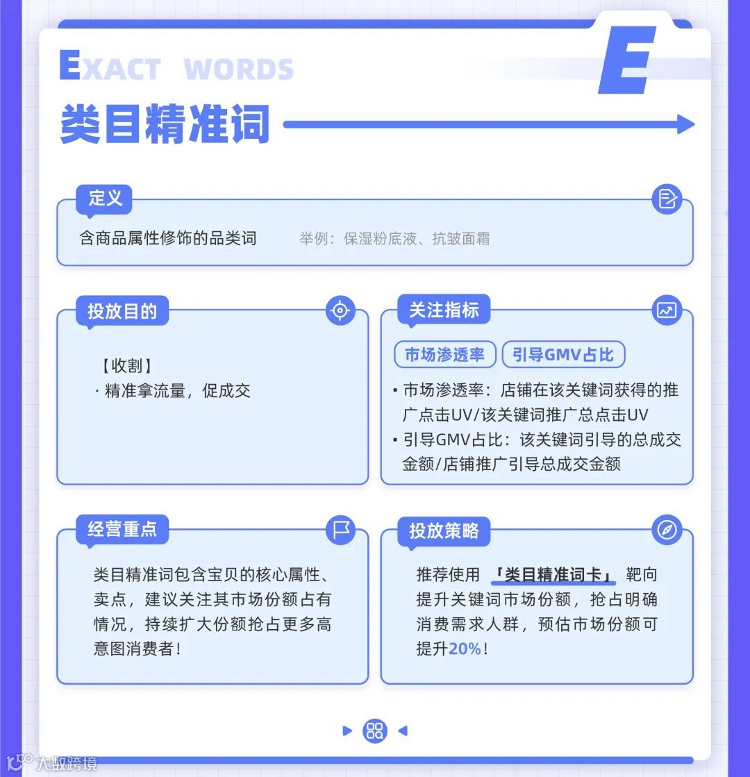 经营重点在于,关注商品的核心卖点和市占情况。商家可以使用「类目精准词卡」靶向提升关键词的市场份额,预估市场份额可提升20%;投放后,还可以通过市场渗透率、引导GMV占比追踪优化。
