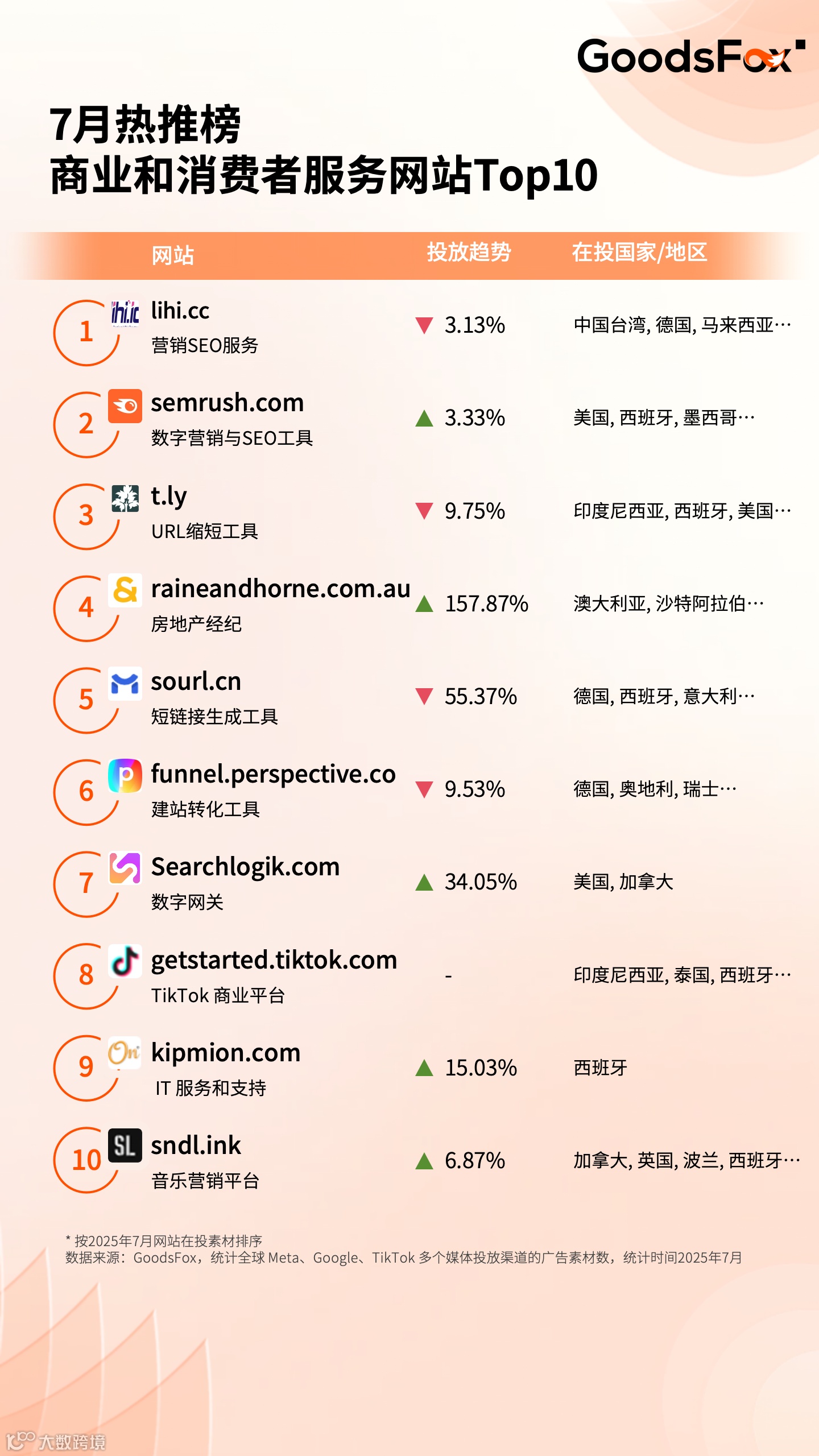 GoodsFox 的「7月商业与消费者服务网站热推榜」,还有以下信息值得关注: