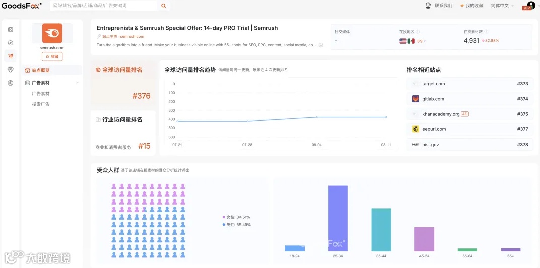 就像 GoodsFox 一样,监测全球网站广告数据,帮助出海企业做竞品分析,以及出海营销决策。