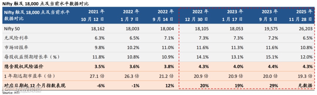 印度股市指数在过去一年的表现逊于全球主要指数。展望未来,我们预计Nifty 50指数未来三年的每股收益增长预期为12%。在此背景下,我们认为Nifty 50指数目前约19倍的一年动态市盈率处于合理区间(过去五年均值约为22倍)。为进一步验证观点,我们计算了Nifty 50指数的隐含股权风险溢价。目前Nifty 50指数位于26,200点水平,10年期国债收益率为6.5%,根据彭博预测,未来三年每股收益增长预期为12%。我们设定Nifty 50未来五年每股收益增长为12%。基于此数据,我们认为当前隐含股权风险溢价为4.3%(五年均值为4.1%)。据此,我们得出结论:Nifty 50指数或被低估。我们还观察到,过去几年中,存在Nifty 50的隐含股权风险溢价处于约4%-4.4%区间的情况。在该情况发生时,其后一年Nifty50指数表现都相当强劲,未来12个月回报率达到两位数(见下图)。因此,我们认为当前Nifty 50指数处于合理区间,预计未来12个月有望实现可观的双位数回报。