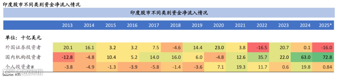 外国证券投资资金流近年来波动剧烈。在2023年强劲流入207亿美元后,2024年资金流放缓至接近中性水平(1亿美元),而2025年迄今则显著转为负值,截至2025年10月流出达160亿美元。另一方面,国内机构投资者为市场提供了持续支撑。其净流入从2023年的220亿美元增至2024年强劲的630亿美元,且2025年迄今进一步增至728亿美元,抵消了外国证券投资参与度萎靡。系统性投资计划的月均流入呈上升趋势,2023年平均为19亿美元,2024年为27亿美元,2025年为32亿美元。此外,印度资本市场蓬勃发展,过去一年IPO融资约250亿美元,且预计很快将有数个大型发行。我们认为,今年一级市场持续的股票供应叠加创纪录的资金规模争相涌入,使股指保持区间震荡。