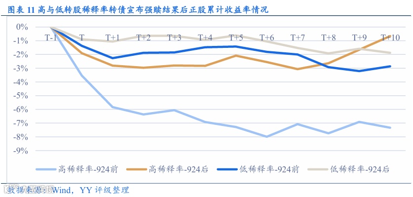 此外,不同转股稀释率转债的正股价格变动情况有所不同。根据T-1日转股稀释率10%进行区分,可见高稀释率转债的正股价格面临更高的转股退出压力,导致跌幅高于低稀释率的转债正股。不同市场环境下的正股价格走势仍然相应受到影响,但924前的高稀释率转债正股明显受影响更大,说明弱势环境下转股退出压力将显著压制正股。