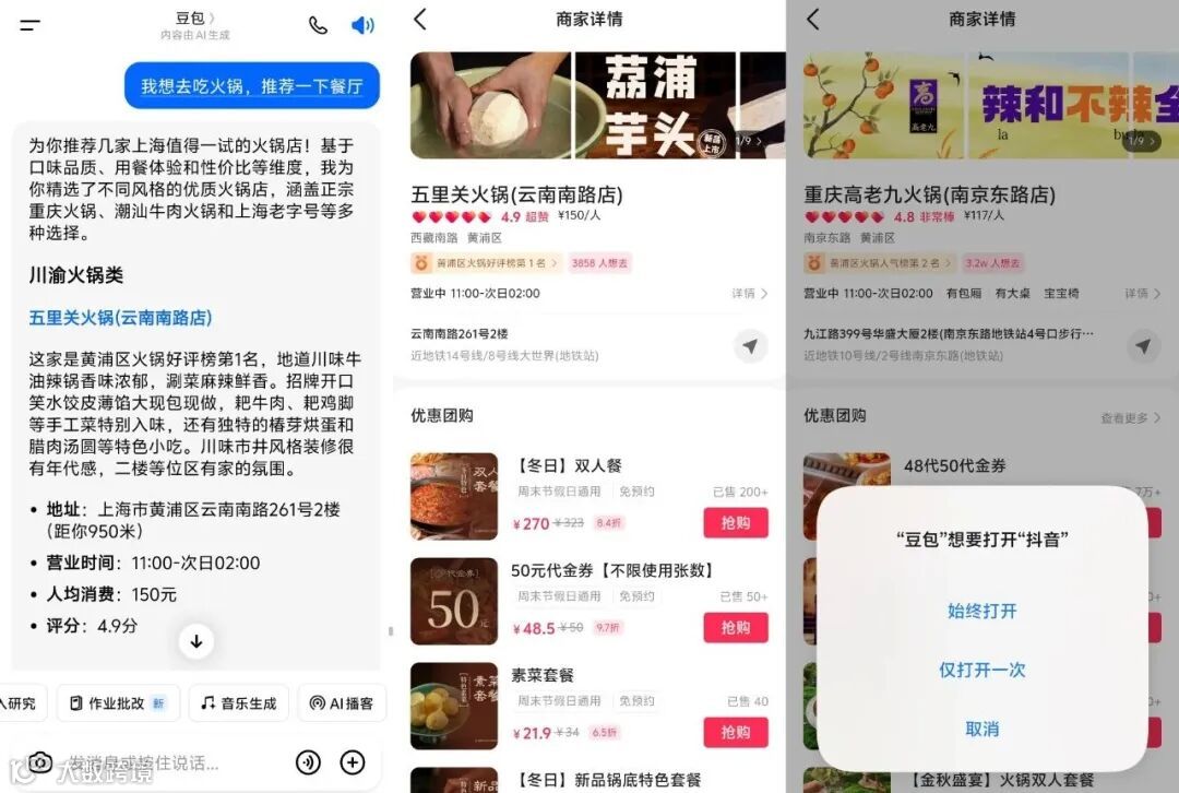 除了电商带货场景,豆包也打通了本地生活服务链路。比如输入“我想去吃火锅,推荐一下餐厅”,豆包会精准推荐一些合适的火锅店,包括评价、地址、营业时间、人均消费、评分和餐厅照片等信息,点击链接即可进入商品详情页跳转下单。