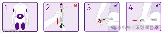 步骤 4:按住 10 秒钟按住紫色注射按钮长达 10 秒钟。听声音:第一声咔哒 = 注射开始,第二声咔哒 = 注射完成。当灰色柱塞可见时,代表注射完成。注射后,请不要随意弃置用过的笔,避免儿童或宠物误伤。