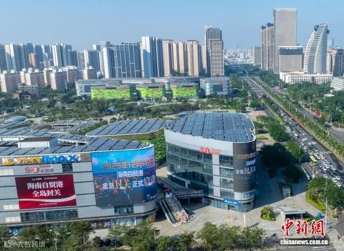 12月17日,位于海口市国兴大道的海控全球精品免税城电子屏上,海南自贸港全岛封关的字幕引人注目。 中新社记者 骆云飞 摄