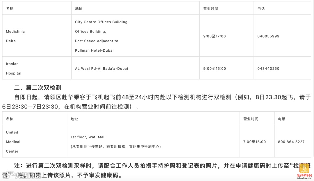 2021年6月30日,中国驻阿联酋使领馆更新了指定双检测机构名单: