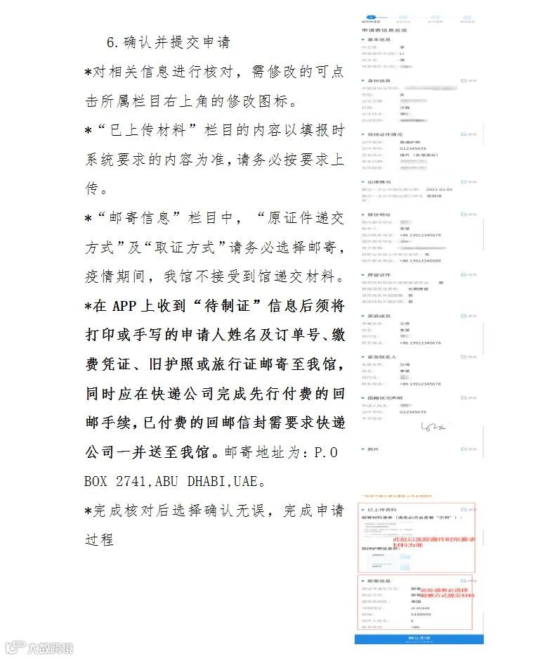1、递交材料:鉴于阿联酋的疫情形势,我馆目前不接受到馆递交材料。如无特殊情况,所有办证材料均可通过APP线上提交。护照或旅行证换发业务申请人请选择邮寄取件,在APP上收到“待制证”信息后须将打印或手写的申请人姓名及订单号、缴费凭证、旧护照或旅行证邮寄至我馆,同时应在快递公司完成先行付费的回邮手续,已付费的回邮信封需要求快递公司一并送至我馆。旧照注销后将同新证件、发票一同寄回。我馆邮寄地址为:P.O BOX 2741,ABU DHABI,UAE。