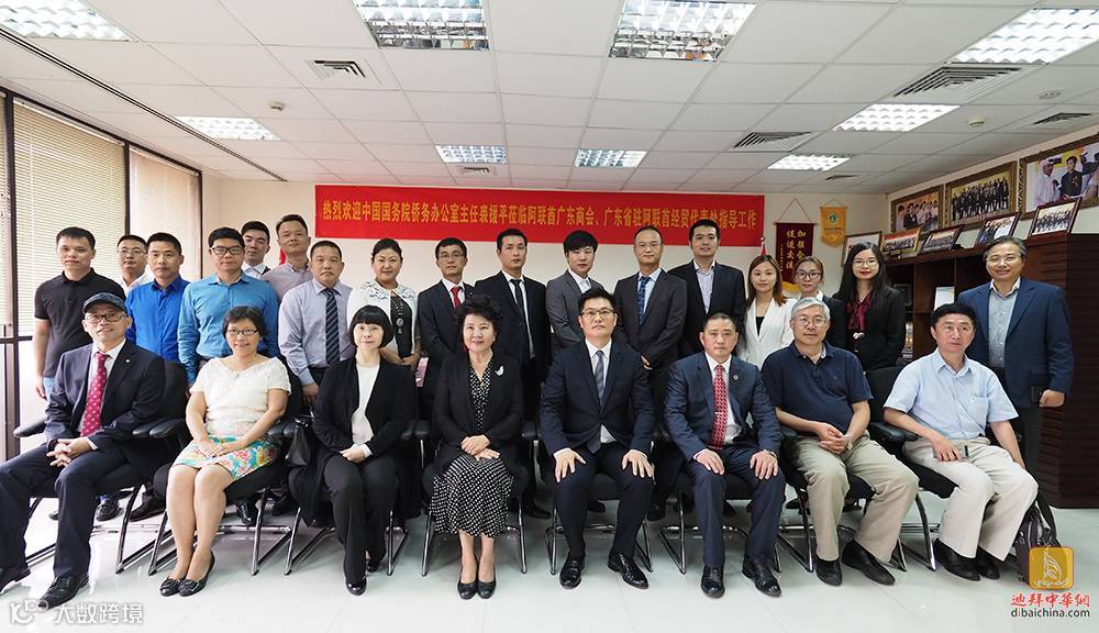 迪拜时间2017年9月1日下午4:30国侨办裘援平主任一行在阿联酋广东商会会所考察访问。由裘援平主任代表团、中国驻迪拜总领馆李凌冰总领事、中国驻迪拜总领馆徐海风主任、阿联酋广东商会张钦伟会长、国侨办代表团一行和阿联酋广东商会理事会成员及广州籍商企代表、阿联酋媒体一起参加了本次座谈会。