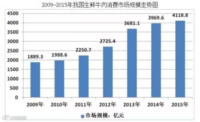 中国的牛肉市场规模在2010年以后开始呈现出井喷状态。中经先略的报告显示,2015年,中国的生鲜牛肉消费规模达到4118.8亿元,超过了2010年时的两倍。这其中进口牛肉也占据了很高比重。据北京青年报消息,中国去年牛肉进口量达到82.5万吨,金额约26亿美元。而2003年,全年牛肉进口量仅为1500万美元,相差173倍!