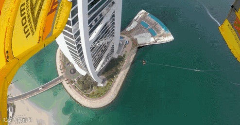 近日,一名专业的风筝冲浪运动员,在迪拜帆船酒店的停机坪上一跃而下,成为了世界上第一个完成这项特技的人。