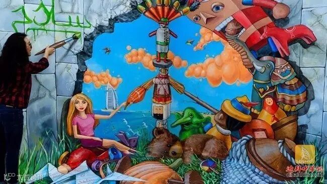 来自中国,号称“中国3D绘画第一人”的齐兴华也来到迪拜参与了本次艺术节。他的画作用上了骆驼、猎鹰和熊猫作为主要元素,象征着中国和阿联酋关系的良好发展。