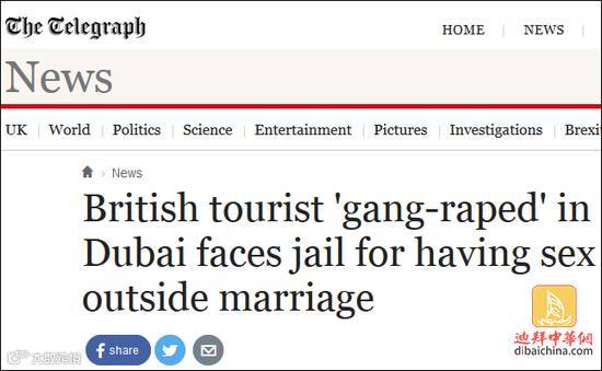 11月16日,据英国《每日电讯报》报道,今年10月份,一名英国女子在迪拜度假时遭两名英国男子强奸,该女子向当地警方报警时,竟遭扣押并没收护照,理由是该女子涉嫌“婚外性行为”,违反了阿联酋的法律。报道称,按照伊斯兰教法,婚外通奸不被允许。在阿联酋,禁止已婚人士发生婚外性行为,单身人士也禁止与已婚人士有性行为。