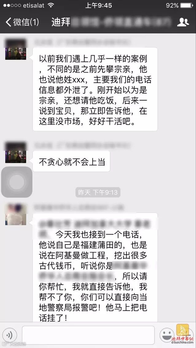 另从个别群里也了解到,还有好几位在阿吉曼朋友,他们也接到类似电话,有说自己是某某城市的,现在在阿吉曼做工程,挖到很多古币钱币,听说您是某某,人脉广,所以请你帮忙。这里提醒所有在阿华人,请接到电话第一时间记住手机号码,可直接报警,也请多扩散预防,杜绝骗局维护在阿华人形象!