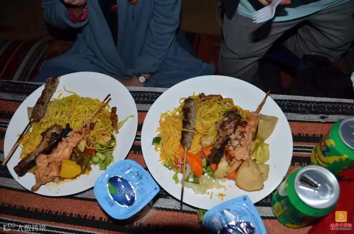 大约在6点45分时表演开始,七点多广播里会提示你可以开始取餐啦。这里也要注意男女分开排队哦。快看我们的晚餐其实还是很丰盛的。烧烤,炒饭,炒面、水果、骆驼奶、还有一些蔬菜,通心粉等等。