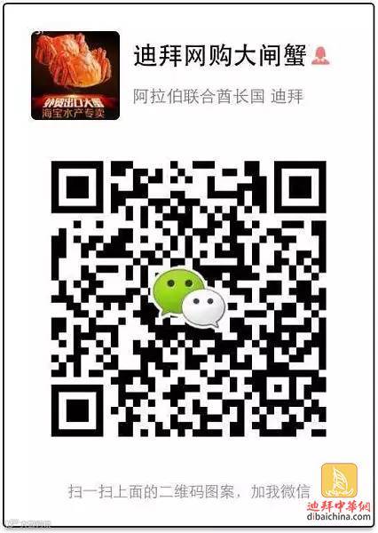 扫描二维码添加微信号 – “迪拜网购大闸蟹”发送预定信息及地址,即可享受免费送蟹上门服务。