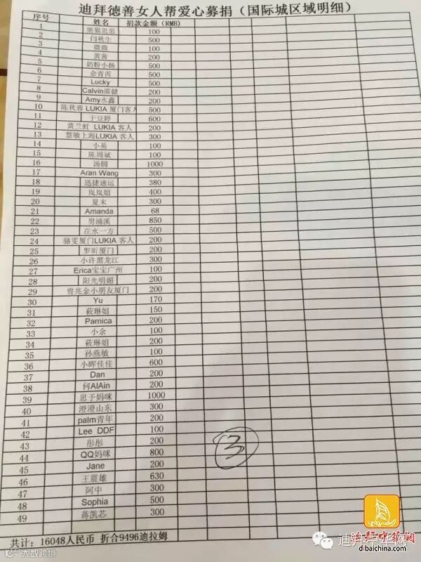 所得善款总金额经过仔细核对公布如下:(金额以迪拜中华网核实后公布为准,如有误差定及时更正)