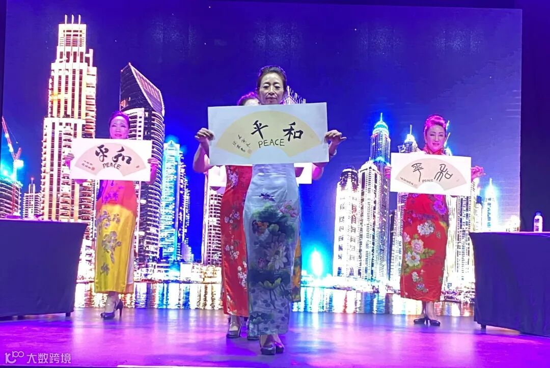 终于轮到了我们的压轴节目“愿世界和平”。我们选用的音乐是全球家喻户晓的“友谊地久天长”。台上两侧的旗袍姐妹挥毫泼墨,奋笔疾书。舞台中间的姐妹们手拉手地飞翔着旋转着,对人类和平的殷切期盼触动了在场所有人心中最柔软的地方,台下观众和着节拍一起歌唱起来,节目结束时姐妹们举起分别用甲骨文,金文,篆书,隶书,楷书,行书,草书等各种书体写成的中文“和平”和英文“peace”的宣卡扇面,对着全场观众深情地呼唤“Sincerely wish world peace and harmony for all nations !” 谢幕之后,这些墨迹未干的宣卡成了真正的艺术品被人一抢而空。3位乌克兰观众含着眼泪走过来,连声说“Amazing, we were moved , Thank you ! China good!”