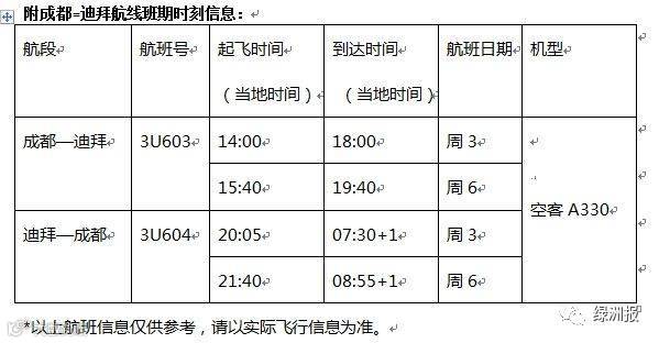 川航成都直飞迪拜航线采用空中宽体客车A330机型执飞,班期为每周3、6。具体航班信息如下:去程航班号3U603,周三14:00从成都起飞,飞行时间预计8小时,于迪拜当地时间18:00抵达;周六15:40从成都起飞,飞行时间预计8小时,于迪拜当地时间19:40抵达。
