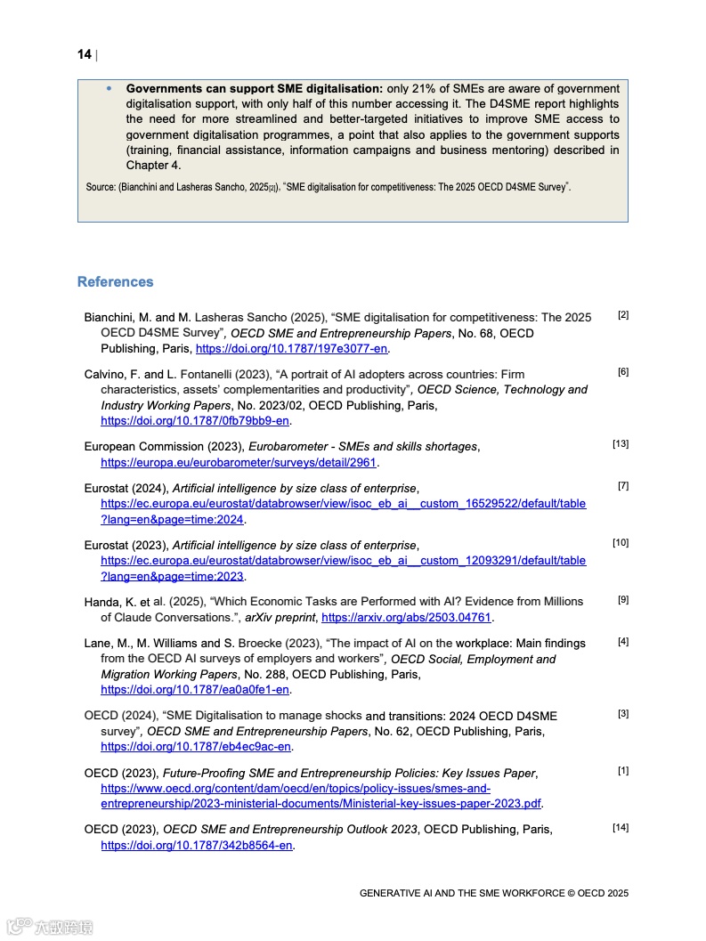 趋势洞察方面,报告认为生成式AI进入“民主化”阶段,低成本和低数据门槛为中小企业带来生产力红利,但深度应用面临技能、法律及治理掣肘。未来企业对高技能劳动力的需求将持续走高,数据分析、创意创新和提示工程等能力成为培训重点,而政府支持和行业组织协作须更聚焦于普惠性培训、合规指引和成功场景复制,以防止数字鸿沟由“有无AI”转向“AI用得好坏”。