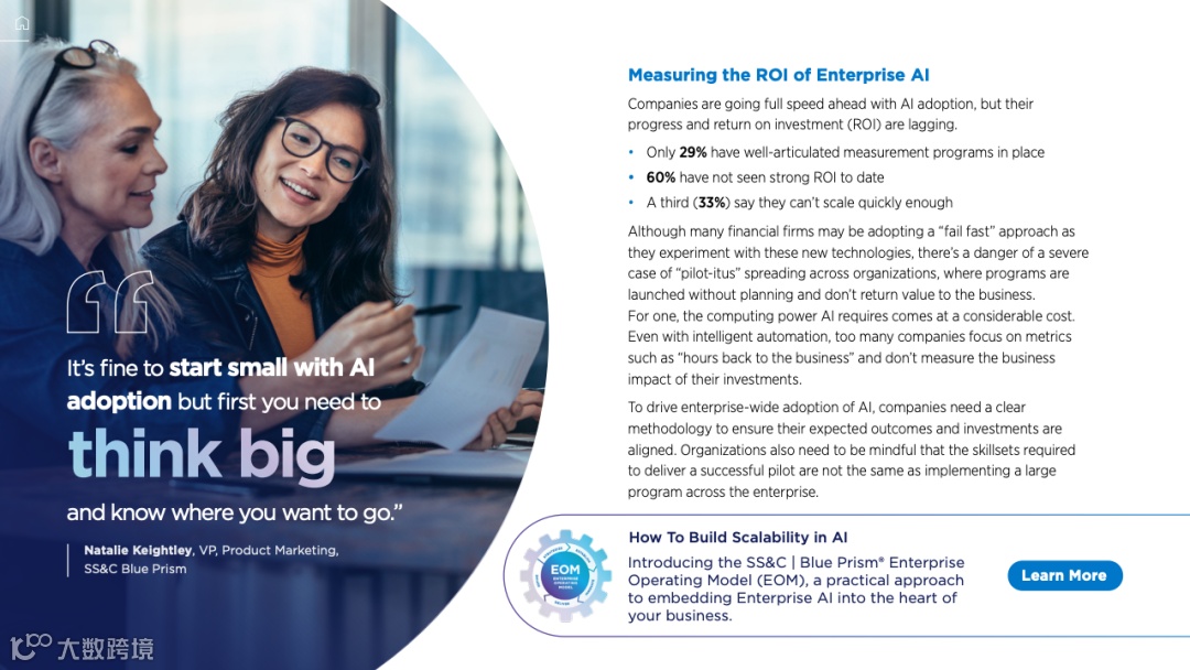 投资回报率的迷雾同样笼罩着行业。尽管投入巨大,但60%的机构尚未看到强劲的投资回报,仅有29%建立了完善的衡量体系。许多企业陷入了“试点项目泛滥”的困境,项目虽多,却缺乏战略规划与实际业务价值的转化,导致资源浪费且难以规模化。