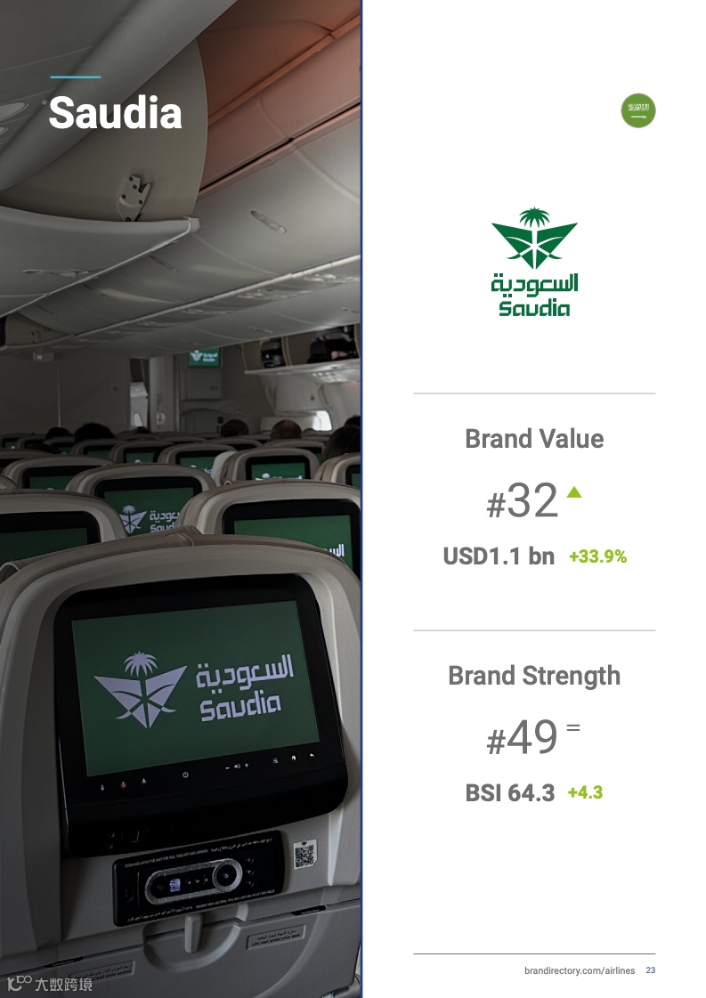 中国南方航空(增长48%,达到41亿美元)也实现强劲增长,但品牌价值仍低于疫情前水平。随着中国国内旅行复苏,南航通过扩大机队和改进服务产品抓住机遇。