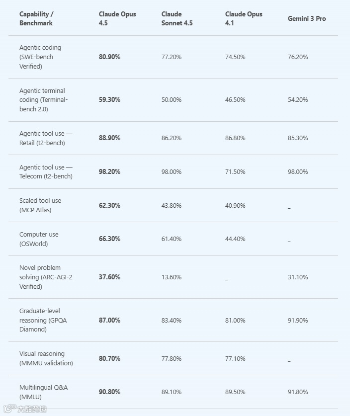 图:Anthropic 提供的 Claude Opus 4.5 基准结果
