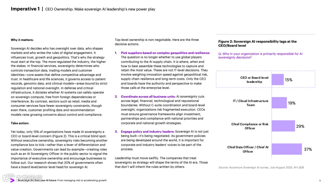 只有19%的组织将主权人工智能视为竞争优势,而48%的组织将合规要求列为其采用主权解决方案的主要动机。在企业内部,主权人工智能仍被视为一个技术问题,因为只有16%的欧洲公司让人工智能主权成为首席执行官或董事会层面的关注事项。