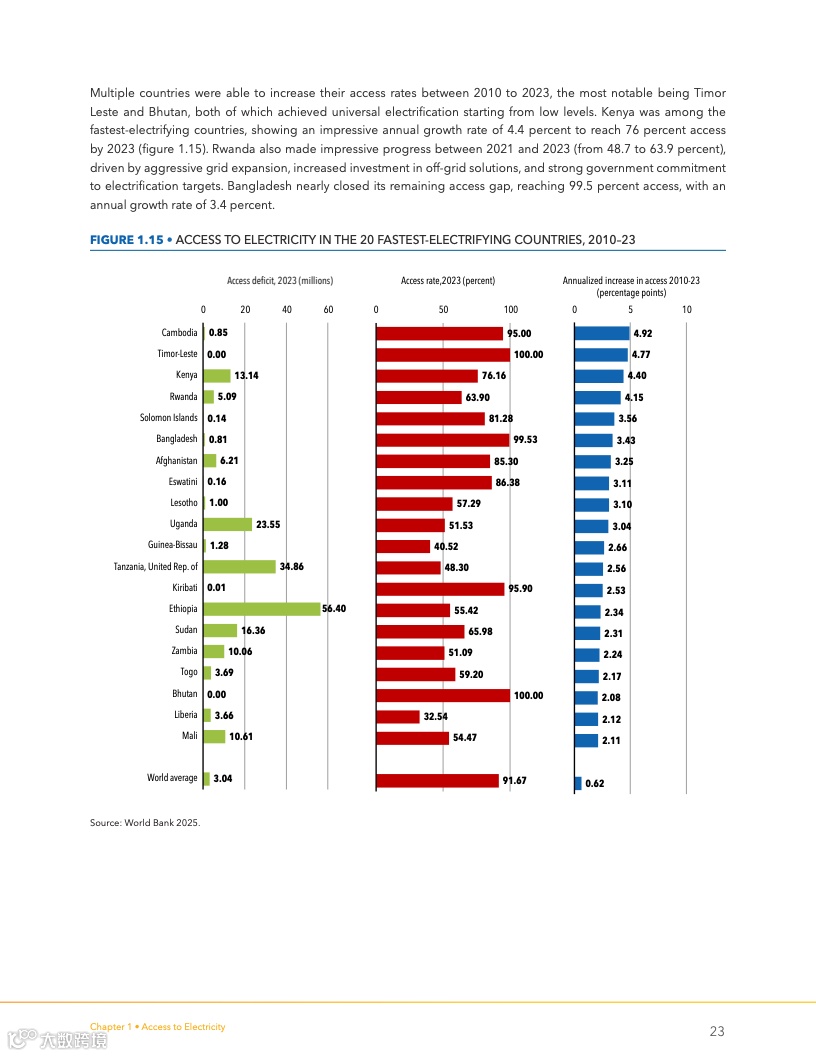 • 目前全球近92%的人口已实现电力可及,但2023年仍有超过6.66亿人无电可用。2023年电力缺口最大的20个国家中有18个位于撒哈拉以南非洲。2020至2023年间电力可及率增幅最大的是中亚和南亚地区,这两个地区在实现全民用电方面取得显著进展,将基本用电缺口从2010年的4.14亿人缩减至2023年的仅2700万人。