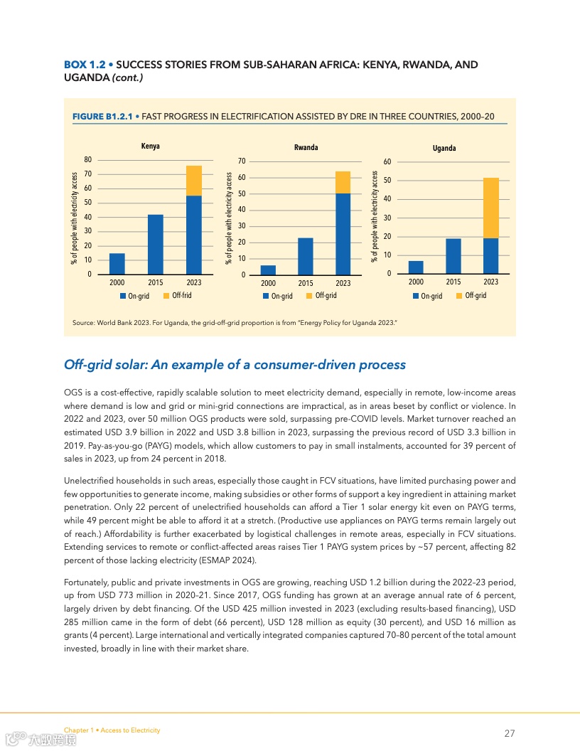 资金不足且成本过高是造成区域不平等和进展缓慢的主要原因。为巩固现有成果并防止电力可及性和清洁烹饪出现倒退,报告呼吁加强公共和私营部门的国际合作,扩大对发展中经济体(特别是撒哈拉以南非洲)的资金支持。亟需采取的行动包括:改革多边和双边贷款机制以扩大公共资本可用性;动员更多优惠融资、赠款和风险缓释工具;提高捐助方的风险承受能力;以及完善国家能源规划和监管体系。