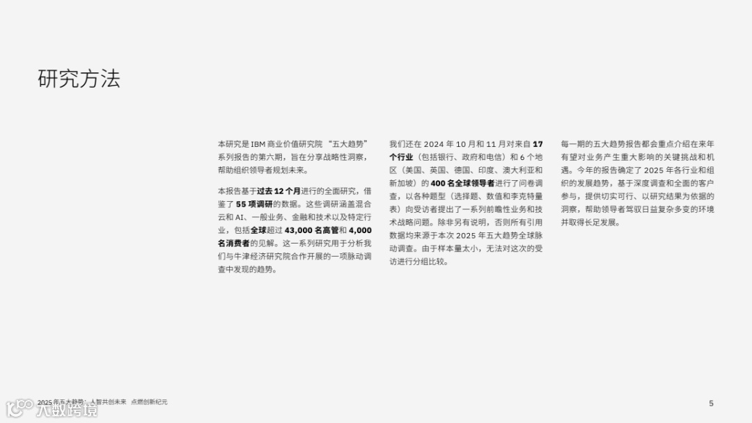 这绝非易事。为了解领导者如何实现这一目标,IBM 商业价值研究院(IBM IBV)与牛津经济研究院在2024年10月和11月联合开展了一项调研,受访对象涵盖17个行业和6个地区的400名全球领导者。我们询问他们,必须克服哪些挑战才能在AI塑造的竞争格局中取得成功?如何让员工做好准备以推动变革?最期待通过哪些机会来加速进展?