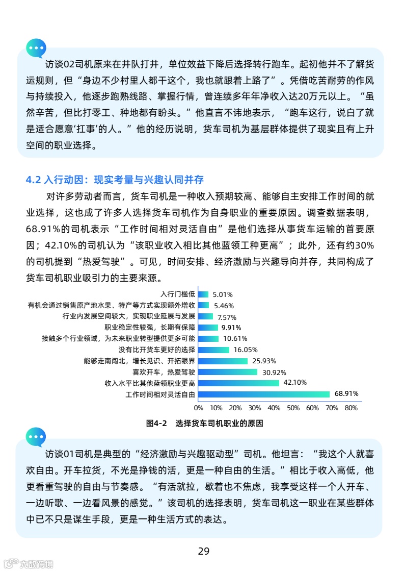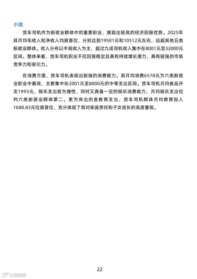 司机月均毛收入19051元,净收入10512元,高于新就业群体,长途司机收入更优。工作强度大,日均工作超10小时,每月休息少于4天,行业高压。