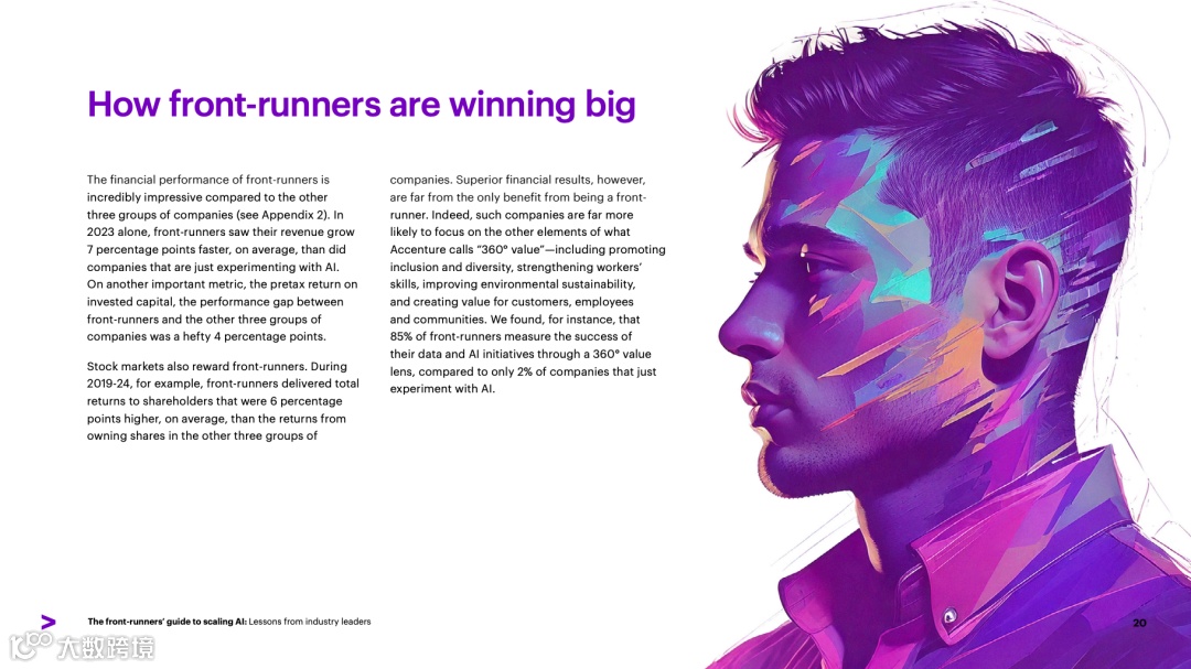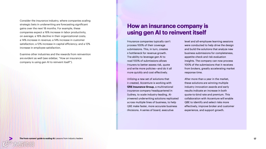 这种领先性直接转化为卓越的财务表现。与仅停留在实验阶段的企业相比,前沿者在2023年的收入增长率高出7个百分点,税前投资资本回报率高出4个百分点,2019至2024年间的股东总回报则高出6个百分点。以保险业为例,规模化AI应用预计将带来劳动生产率提升16%及组织成本降低16%的双重效益。