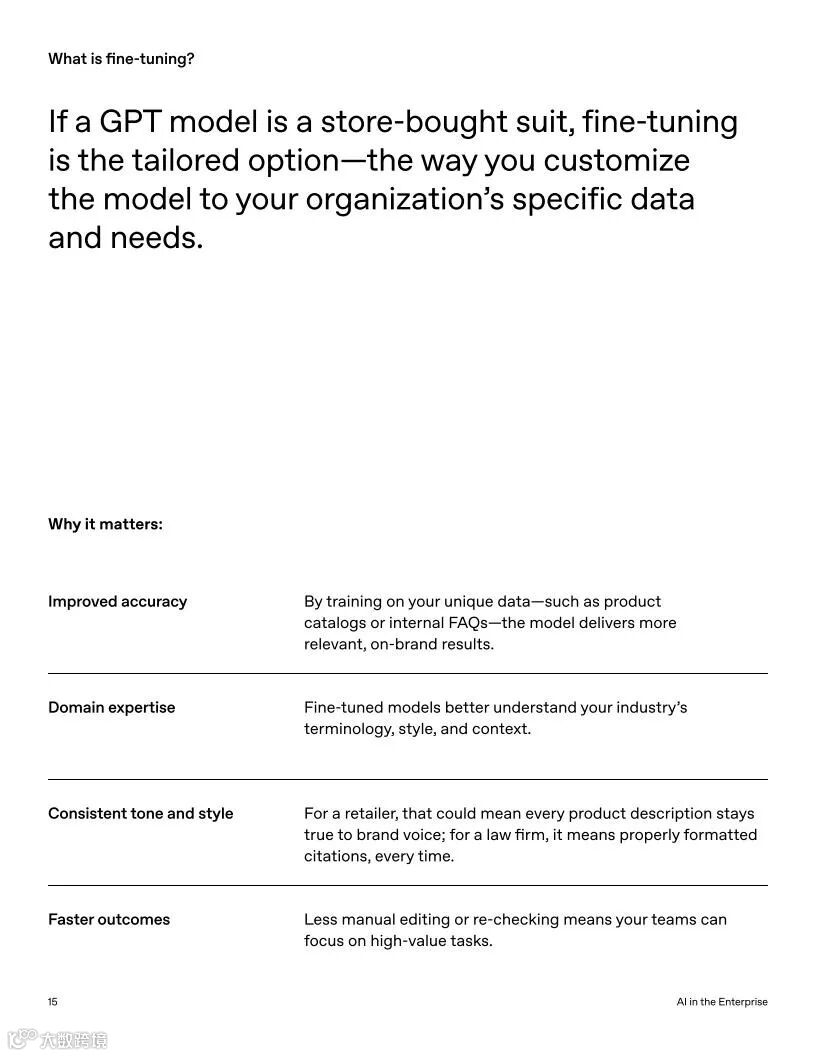 模型定制与微调是最大化AI价值的关键。劳氏通过对OpenAI模型进行微调,将其产品标签准确性提升20%,错误检测能力提升60%。这表明,使用企业自身的特定数据训练模型,能显著提高AI产出结果的准确性、品牌契合度与行业相关性。