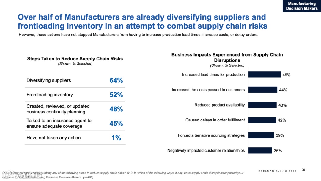 关税对制造业的影响尤为显著,68%的制造决策者对原材料成本上涨深感忧虑,63%关注价格提升及利润率受压。为应对关税政策,约半数制造商增加库存,41%加大国内制造投资,40%实施供应商多元化战略。成本压力最终传导至客户,有32%的企业计划将成本完全转嫁,44%采取部分吸收、部分转嫁的策略。代理人则反映,65%的客户计划将关税增加的成本转嫁给终端客户。