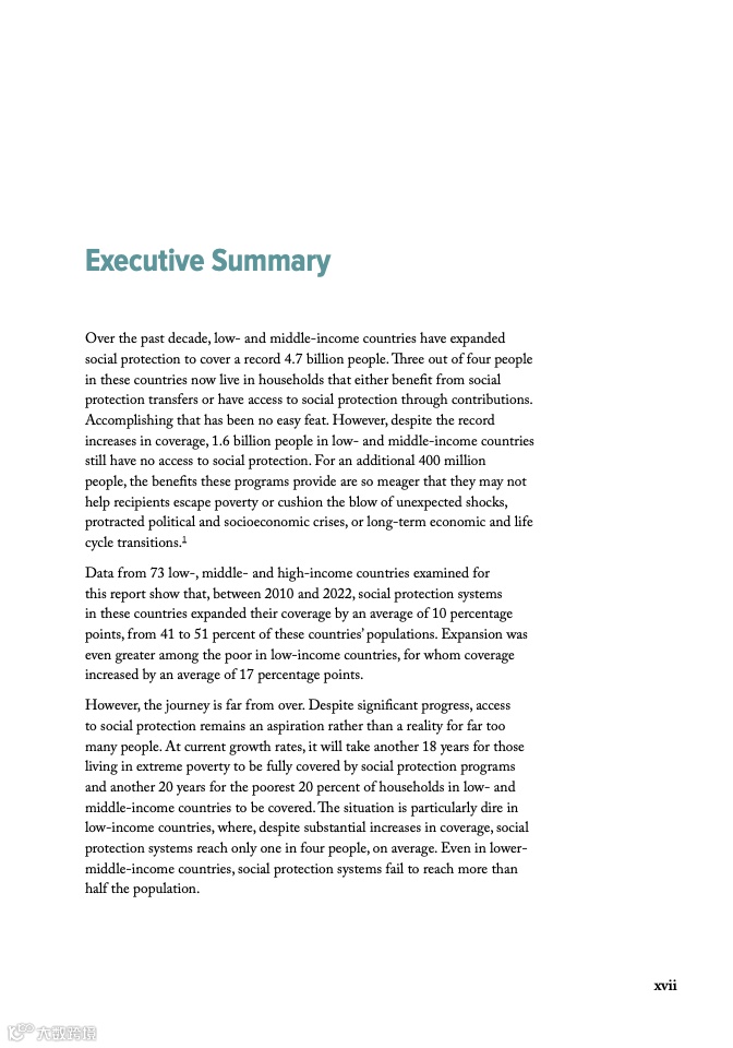 本报告涉及的73个高、中、低收入国家数据显示,2010至2022年间,这些国家的社会保障体系平均覆盖率提升了10个百分点,从占人口41%增至51%。低收入国家贫困人口的覆盖率增幅更为显著,平均提高了17个百分点。