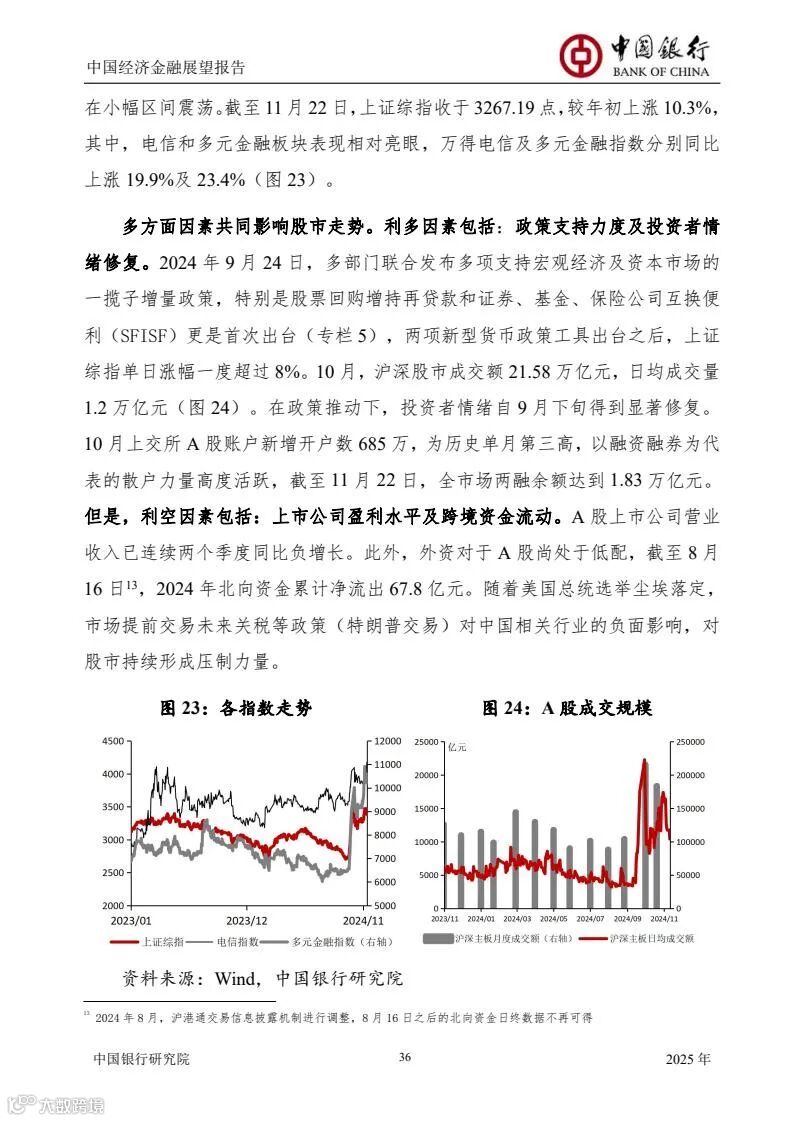 2024年,中国经济总体平稳运行,全年呈现“v”字型走势。前三季度经济景气逐季走弱,9月份以来,一揽子稳经济增量政策加力推出,诸多领域出现积极变化。但当前经济回升基础还不牢固,外需支撑难以抵补内需不足,新兴产业发展难以抵补房地产等传统产业拖累,经济结构性、周期性转换过程中的多重阵痛依然明显。初步预计,全年GDP增长5%左右。