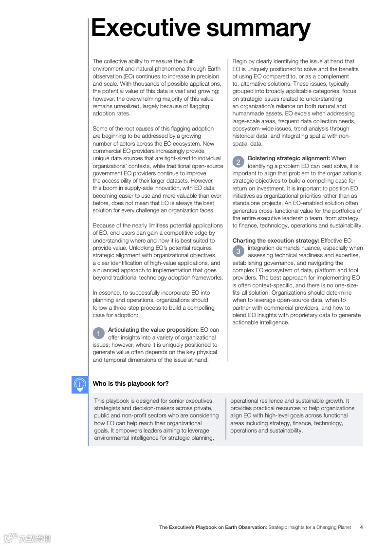 在价值主张方面,地球观测适用于大规模、远程监测场景,如早期预警、供应链监控和环境影响披露。例如,在精密农业中,它可优化作物产量,减少水肥浪费;在选址决策中,帮助识别矿业或可再生能源的最佳位置。报告列出九大类别问题,包括消费者体验、灾害恢复和脆弱性分析,这些领域中,地球观测的时空整合能力优于传统数据源。结合人工智能和多模态大语言模型,分析效率正快速提升,使非技术用户也能获取即用洞察。