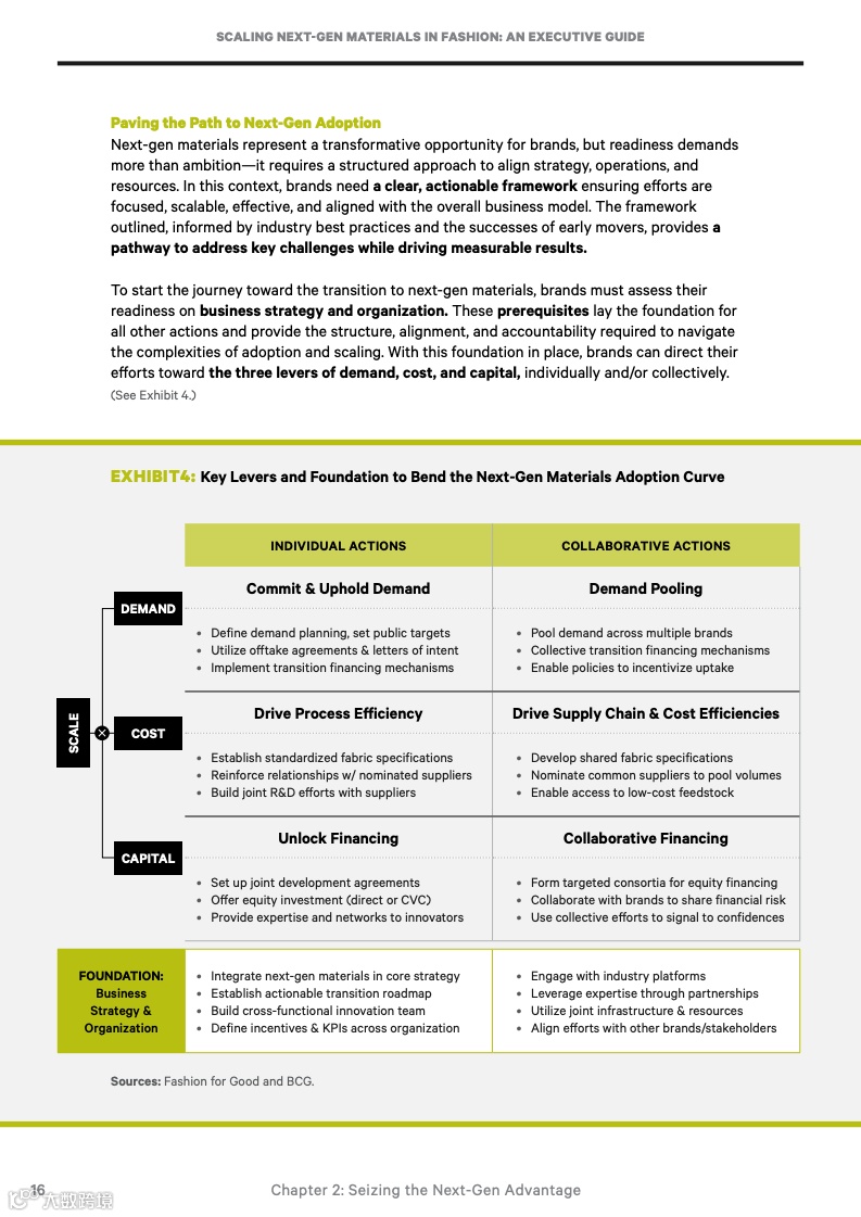 下一代材料,包括纺织品到纺织品回收聚酯或实验室种植的棉花,代表了时尚产业显著转变其影响的关键机会。这些是具有增强可持续性、性能或功能性的创新纤维和材料,目前处于早期商业化或开发阶段,需要进一步的技术进步和成本优化以实现广泛采用。采用这些材料正在成为一项商业必需,受到欧洲及其他地区日益严格的法规、消费者需求的变化以及快速技术进步的共同推动。随着对这些材料的需求预计将在2030年超过供应,现在比以往任何时候都更需要行业集体行动。